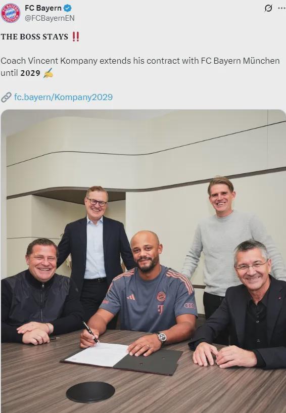 官方:拜仁宣布和孔帕尼续约到了2029年。