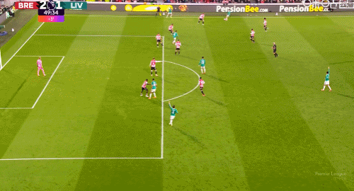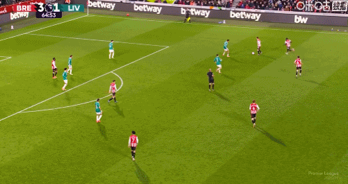 第88分钟,萨拉赫左脚停球右脚抽射破门,利物浦2-3布伦特福德