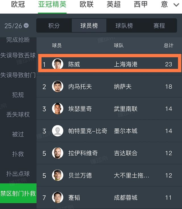 根据最新的亚冠精英联赛数据统计,陈威有多达4项数据高居全亚洲第一。第一个就是扑救总次数,他4场就完成28次扑救,比很多打满本赛季亚冠精英联赛的门将扑救次数还要多。排在他身后的是伊朗国门贝兰万德和乌兹别克斯坦国门内马托夫等人。